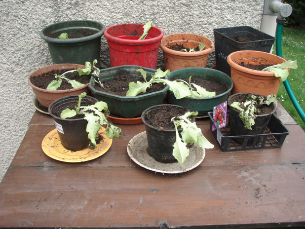 Le potager perché 2016 avec des feuilles de chêne ( sur la grosse cuve d'eau de pluie pour les mettre à l’abri des limaces)