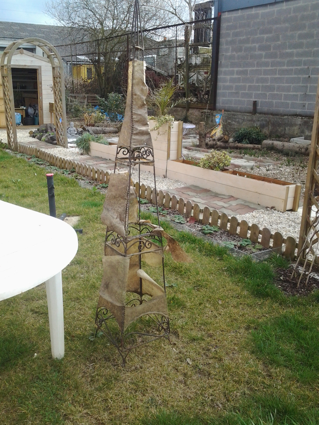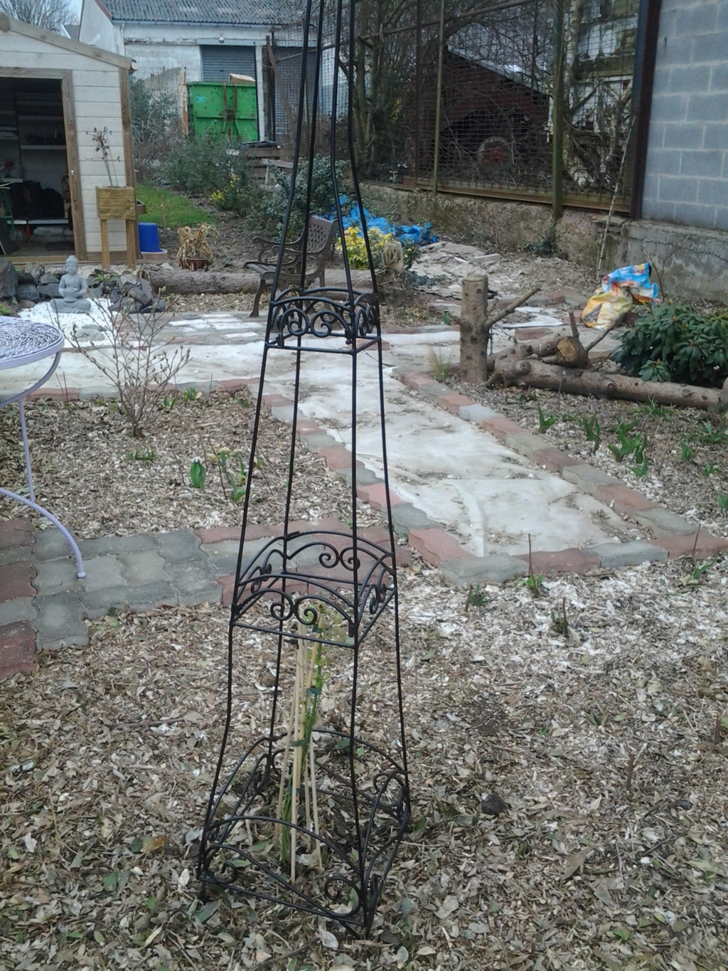 Moi, j'y aurais bien mis des pois ou une plante grimpante décorative. Ancrée au sol par des tendeurs.