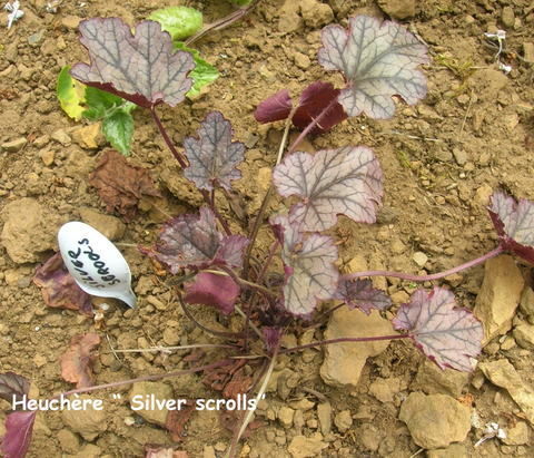 Superbe marbrure des feuilles de cette heuchère dans les pourpre, rose et argenté.